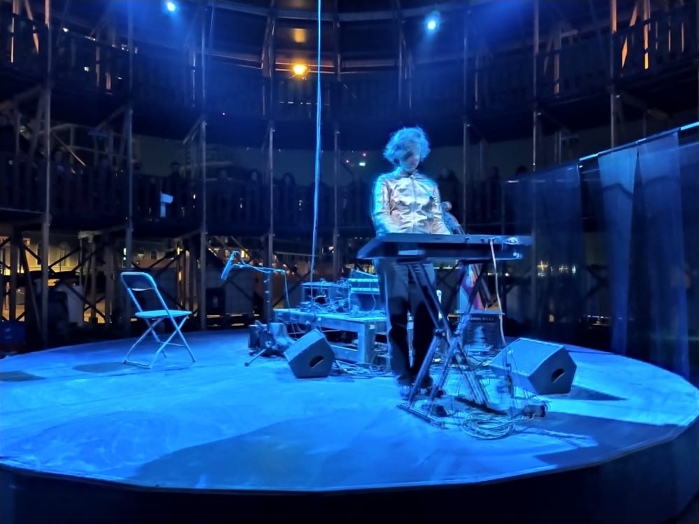 De avond ging van start met voorprogramma Miaux. Mia Prce, aka Miaux, begaf zich naar het podium, dat voor de gelegenheid overigens ook effectief ronddraaide. Prce was gekleed in een gouden vest, een visuele contradictie voor de rest van de setting. Want hoewel het houten gebouw best een indrukwekkende verschijning was, baadde het podium vooral in soberheid. In het geval van Miaux, een dame met haar keyboard.