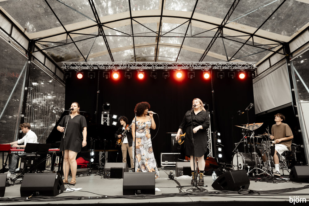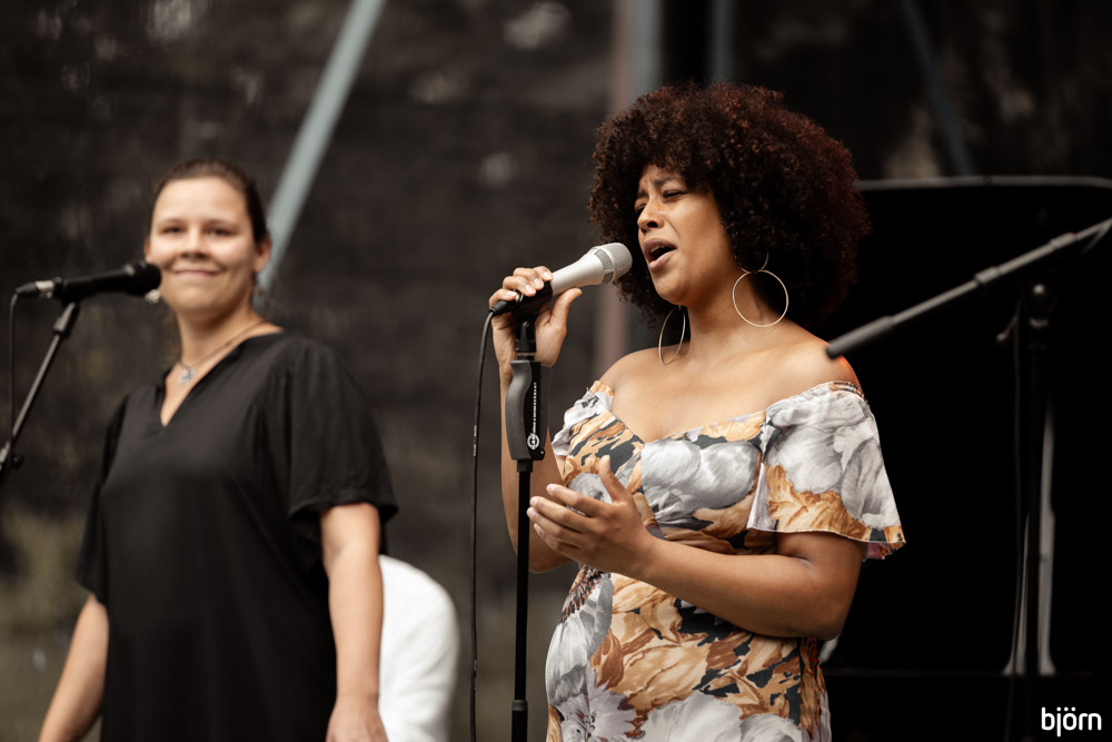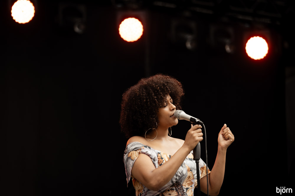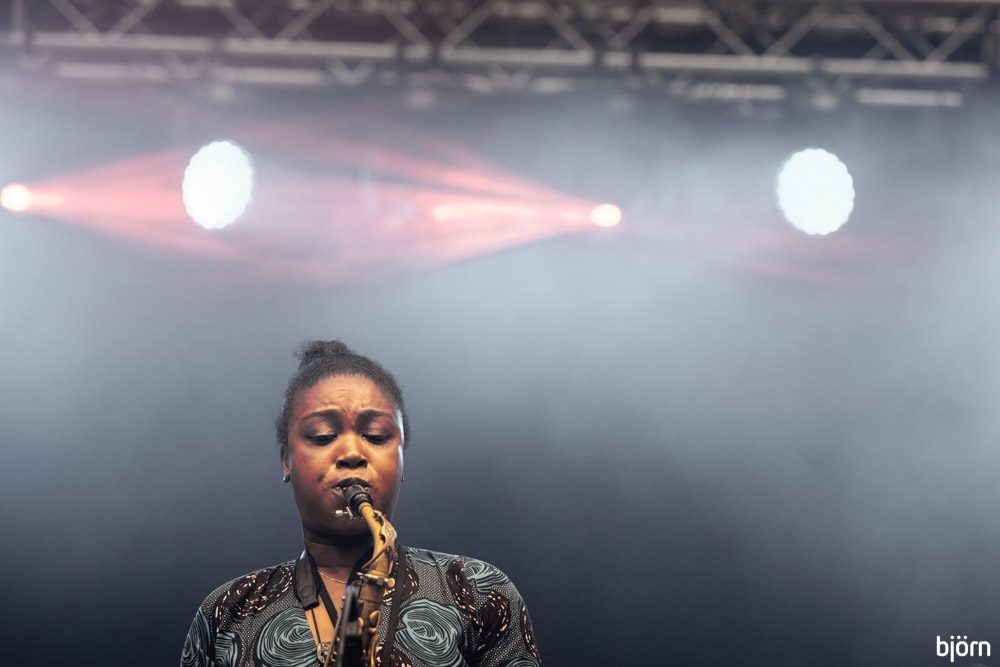 Tijd om voor het eerst het kanaal over te steken voor de Nigeriaans-Britse saxofoniste Camilla George en haar kwartet bestaande uit Renato Paris (toetsen), Rod Young (drums) en Jihad Darwish (contrabas). Ook George was zichtbaar opgelucht en tevreden dat ze toch kon spelen en die vreugdevolle energie stroomde rechtstreeks de volgelopen grasvlakte voor de GEM stage in.