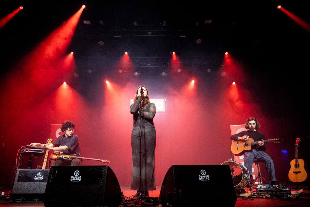 Nog sterker was het geluid dat het drietal de zaal instuwde. Mysterieus, hypnotiserend en ongrijpbaar. Zelf noemen ze het “eigenzinnige, experimentele indietronica” en daar kunnen wij ons wel iets bij voorstellen. Versyck als een donkere sfinx, rijzig in het midden van het podium, klonk in het eerste nummer een beetje als Björk, al vervaagde die vergelijking naarmate de set vorderde.