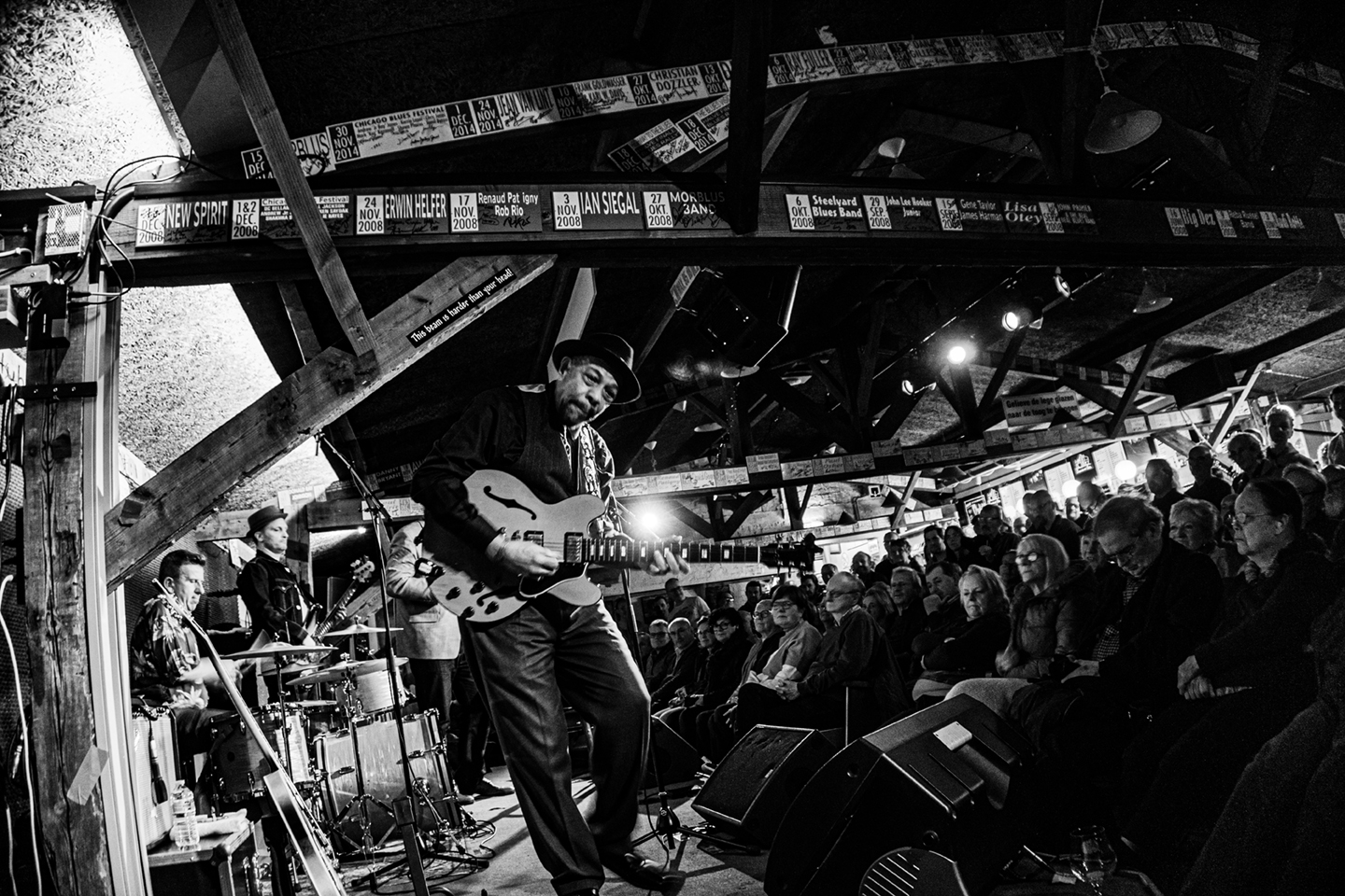 De Banana Peel was tot in de nok gevuld met bluesfans allerhande uit heel het land. Primer heeft dan ook een trackrecord die leest als een encyclopedie van de blues. Speelde onder andere bij Junior Wells, Muddy Waters en Willie Dixon’s Chicago All Stars en is sinds midden jaren 90 solo bezig. In Ruiselede was de strakke ritmesectie Frans en op mondharmonica Giles Robson, een imposante Brit met brillantinekuif, die net uit The Sopranos kwam weggelopen.