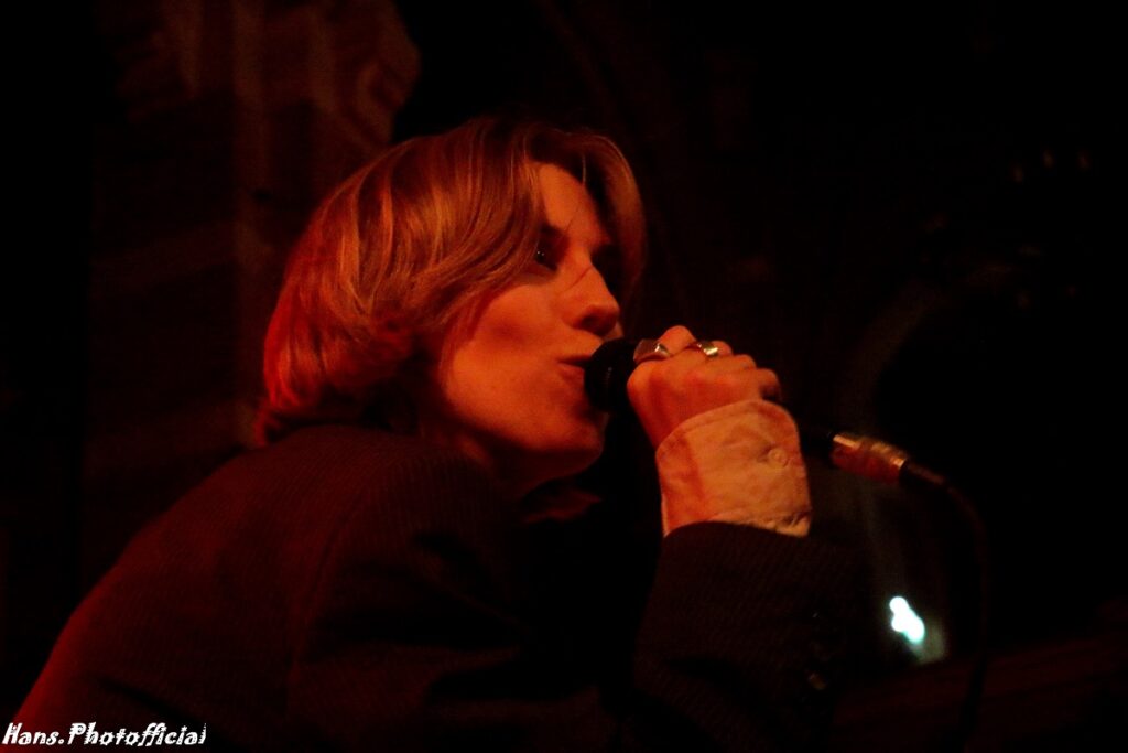 We begaven ons naar Baanhof want daar wachtte een opmerkelijke dame ons op. Opwachten is een groot woord want Jessica Matthews vertelde ons nadien dat ze al blij was met 2 luisteraars. Groot was haar verbazing – wat ze ook meteen uitsprak – toen ze haar optreden als Balderdasch aanvatte, samen met haar twee muzikantes. Baanhof was immers aardig volgelopen en wie daar was, heeft een grote artieste aan het werk gezien. Jessica is op werkelijk elk vlak een buitenbeentje, iemand die constant controverses uitlokt en daar een goddelijk plezier in schept. Wij houden nogal fel van dat soort personen, zolang ze ons maar aan het denken zetten. We hadden bijna hoofdpijn van het denken. Alles begint met haar uiterlijk. Ze is vuurroodharig. Oké, dat is niet abnormaal als je van Corke, Ierland afkomstig bent. Het is niet omdat je nu in Londen woont dat je er minder Iers gaat uitzien.