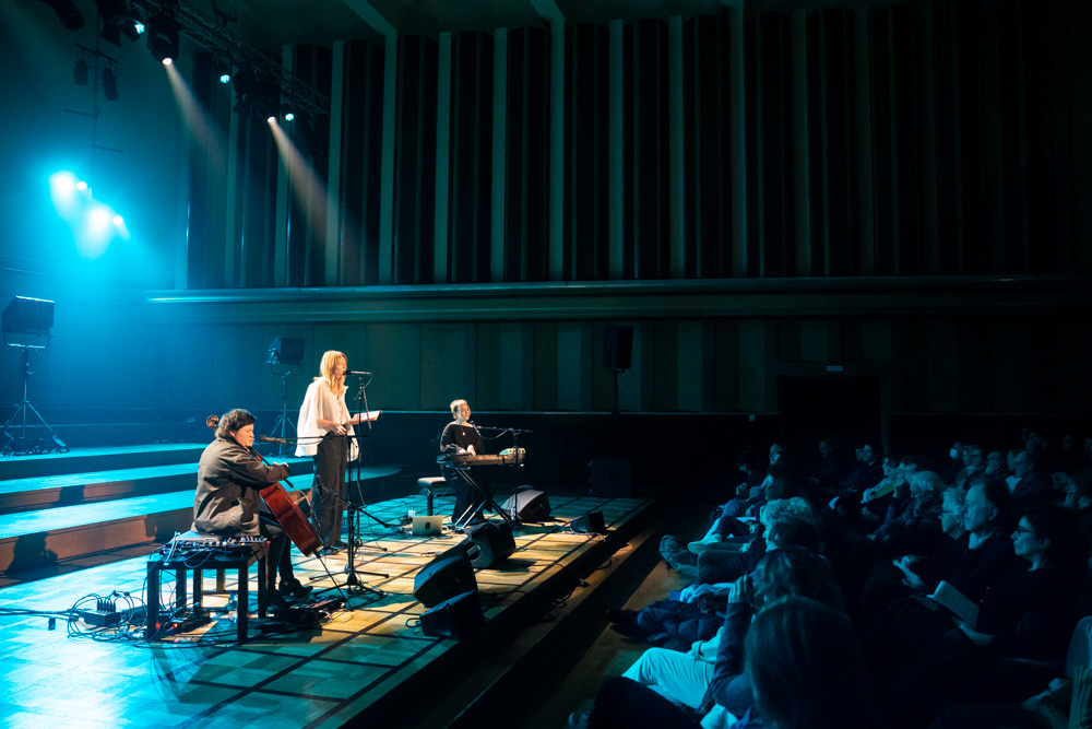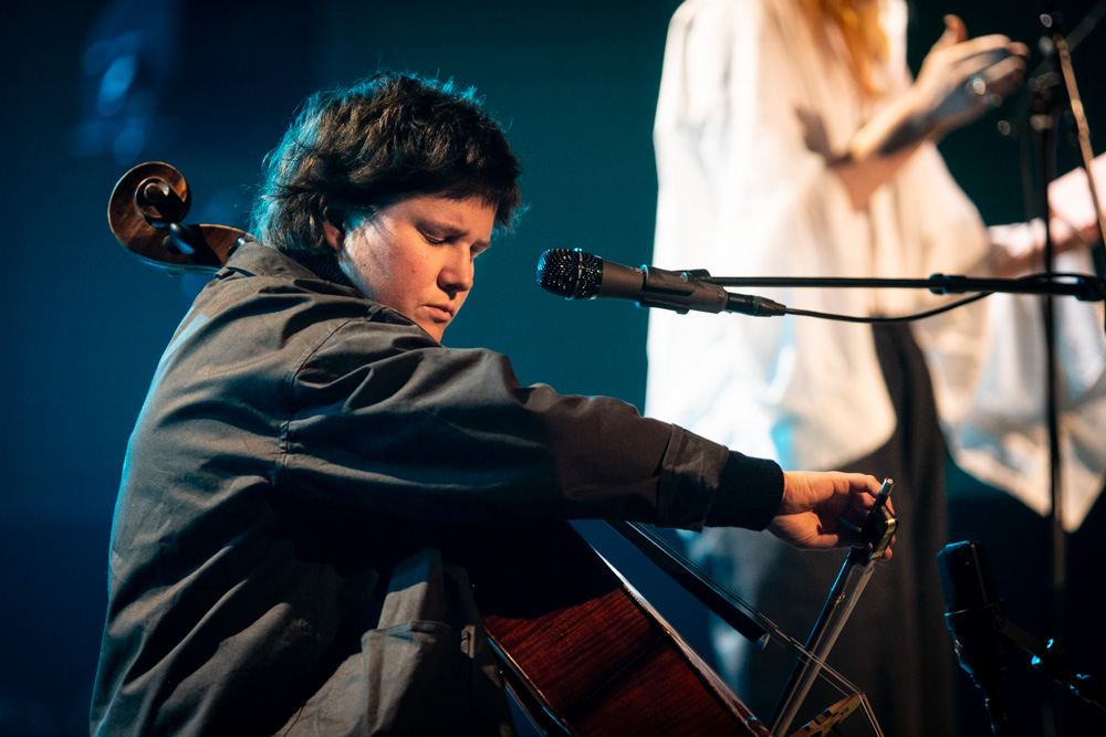 Opener Opkomst begint zoals op de plaat, met de stem van Haerens die in het Nederlands voorleest uit haar dichtbundel. Heel zacht vervoegt een ‘geloopte’, schurende cello haar voordracht. Niet evident hoe Jasmijn Lootens het geluid heel langzaam laat aanzwellen en door middel van effecten een subtiele soundscape creëert die de poëtisch voorgedragen tekst ondersteunt. Het geluid van vallende spelden vult de zaal.
