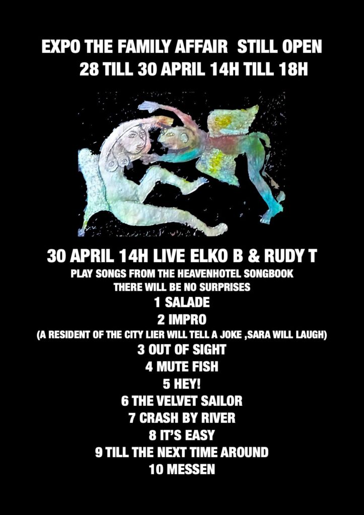 Zoals we eerder in dit artikel bespraken, eindigde op 30 april de groepstentoonstelling The Family Affair, van de familie Trouvé. Net zoals de tentoonstelling enkele weken eerder plechtig werd geopend met een optreden van The Horse Head Bed werd deze even plechtig opnieuw gesloten met een optreden van Elko Blijweert en Rudy Trouvé. Op het auditieve menu? Nummers uit de rijke en eclectische catalogus van Heaven Hotel.