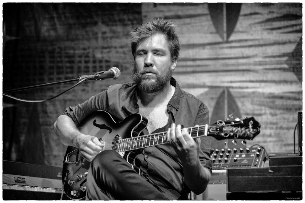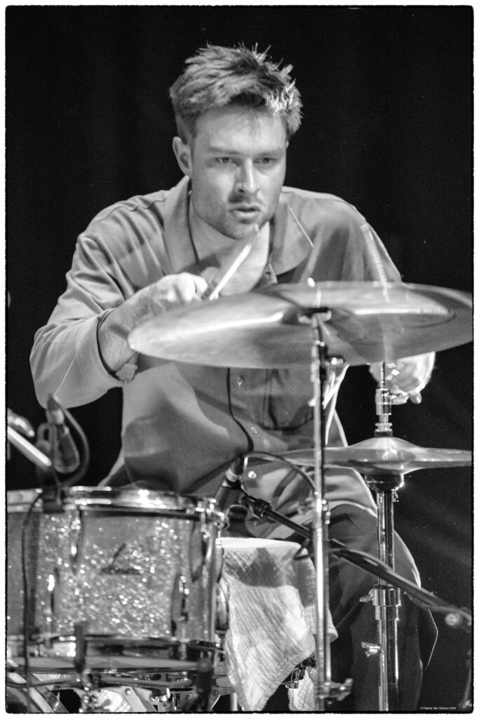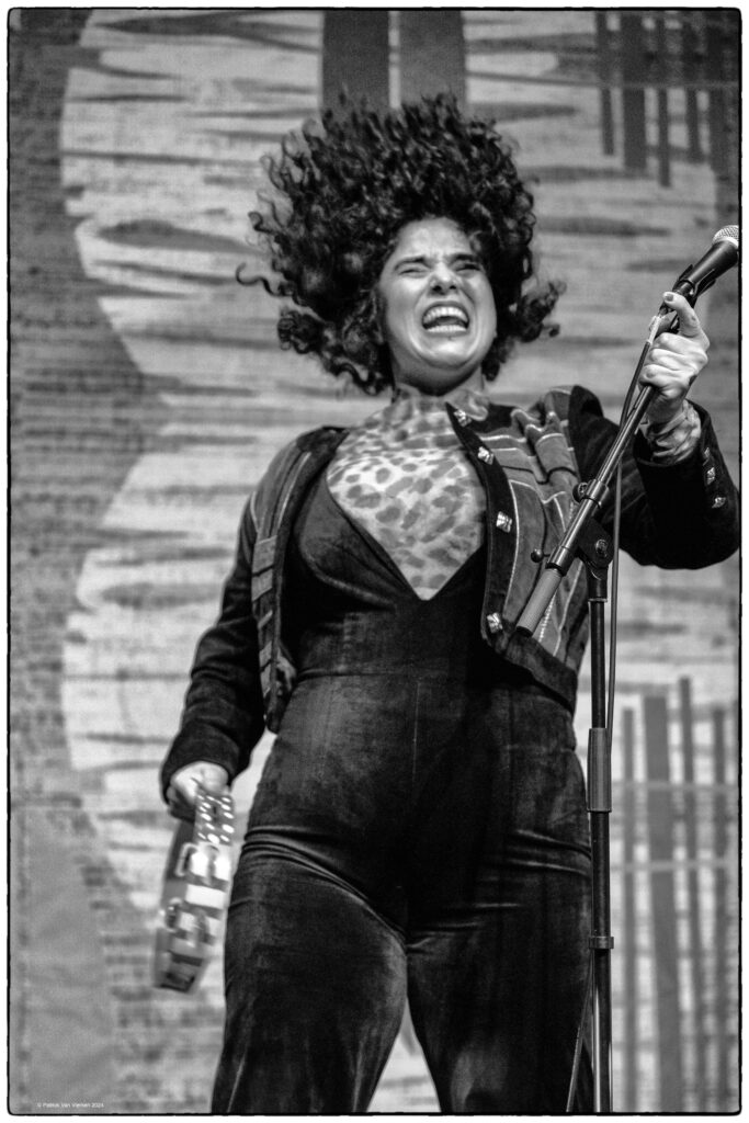 Wayé, de tweede song in de set, sleepte zich rustig op gang aan een gezapig tempo met dreigende gitaarklanken van Doyle, ingetogen percussie van Bouttery, Polat die de maracas ter hand nam, en een ontroerende zanglijn ontwikkelde. Het raakte ons, instant. Gek hé in een taal die je eigenlijk niet kent. En toch. Polat op keys, de song die plots een swingende wending nam, met kleine ‘ontploffingetjes’ en Polat die lustig aan het dansen ging. Geweldige percussie van Bouttery.