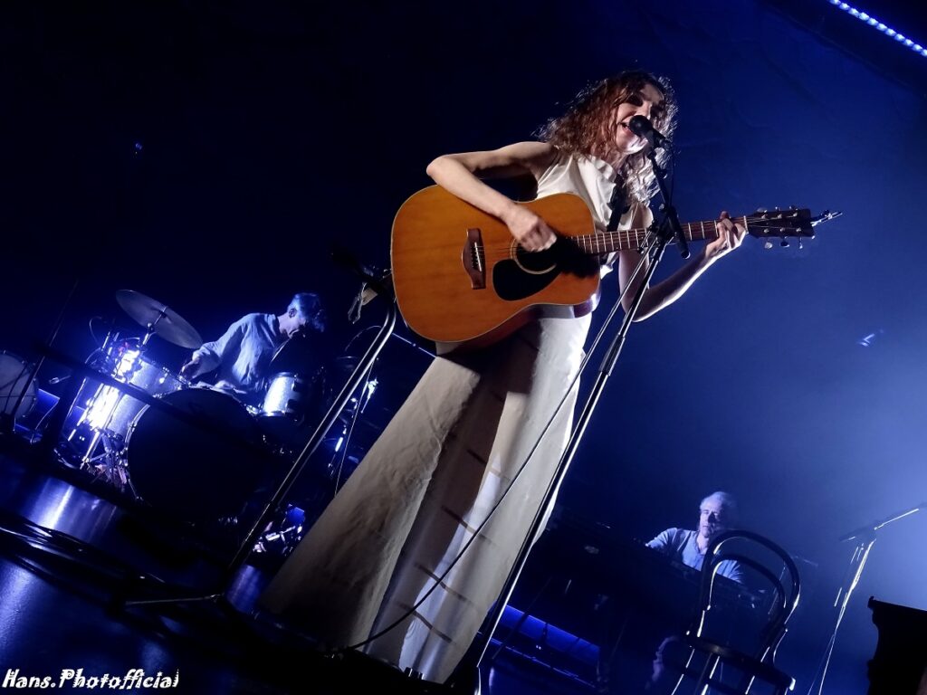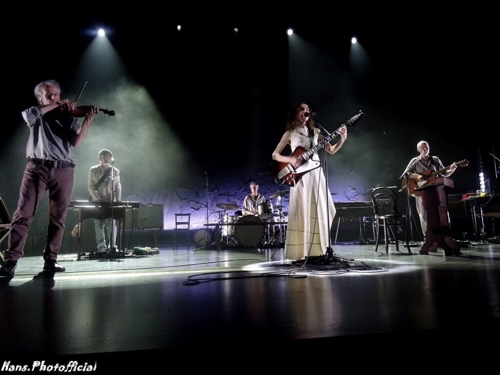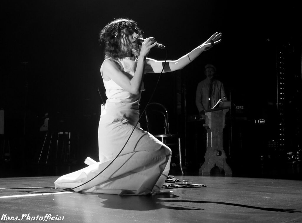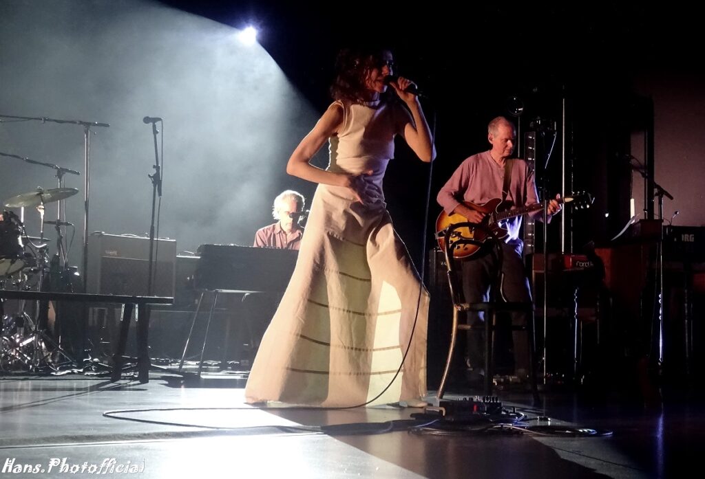 De eerste tranen van ontroering welden massaal op bij opener Prayer At The Gate. Polly zocht de hoogste registers op en versterkte haar vocale prestatie met licht heupwiegend gedans, theatrale bewegingen met de armen en een indringende blik. Gaandeweg werd haar stem scherper en kwam het nummer pas echt hard binnen. Autumn Term zette ze in met vaste kompaan John Parish en liet in het slot het kind in zich los, Ira-Abel in het lichaam van een 54-jarige godin. Dat het een optreden is waarbij elk detail een geregisseerd radertje in het hele verhaal vormde was nooit storend en wekte alleen bewondering op. Polly schreed achteruit, mee bewegend met het helicopterachtig zoeklicht. De toneelspots belichtten de juiste muzikant en het juiste deel van het decor. Instrumenten werden bedaard van eigenaar gewisseld en er was ruimte voor rust en contemplatie. We leken vaak naar een toneelstuk te kijken want iedereen ging wel ergens op een bankje of in een zetel hangen. Polly was zo gracieus dat ze zelfs een Zweedse bank vorstelijk liet blinken, frontaal voor de drums van de ‘pauk’ roffelende Jean-Marc Butty.
