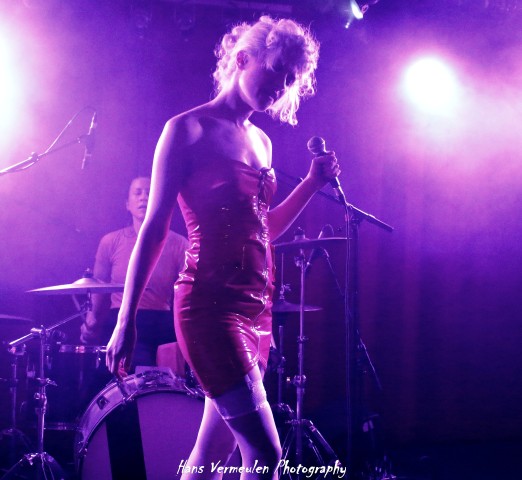 Zangeres Katie Alice Greer heeft al een tijdje gezondheidsproblemen en excuseerde zich ook gisteren voor een kikker in de keel. Een paar weken geleden haalde een maaginfectie een streep door een reeks voorjaarsconcerten. Desondanks verscheen ze als een ravissante diva op het podium in een vintage punkensemble. Een fiftiesstyled latexkleedje, netkousen en fuck-me boots. En of er gevlamd mocht worden. Met Pink White House, éen van de bommetjes van succesplaat Nothing Feels Natural, zat de spreekwoordelijke vlam meteen in de pan. Een aardig gevulde Witloofbar wist meteen de klepel hangen. Good Time Charlie en JJ hielden het tempo hoog. Bassiste Alexandra Tyson is het trio tijdens deze slopende tour komen vervoegen. Priests spelen 19 shows in 21 dagen wat vooral een strak ingespeelde set tot gevolg heeft. Katie geeft het volle pond, een uur lang, en is ook erg goed bij stem.