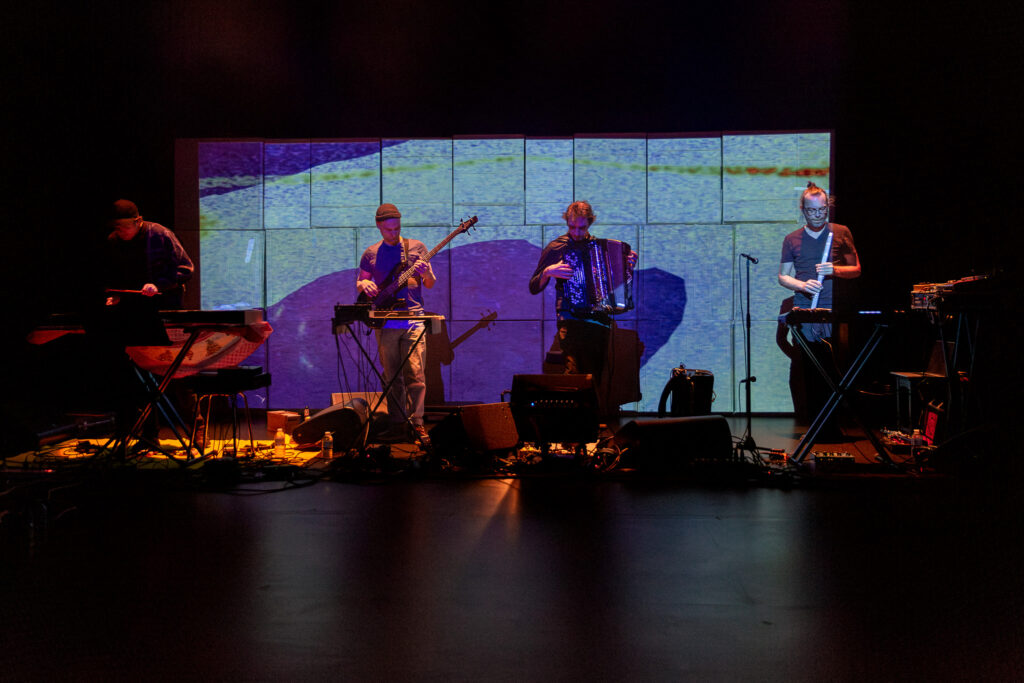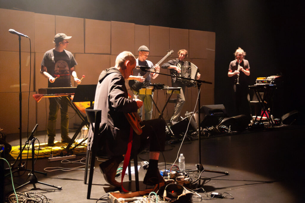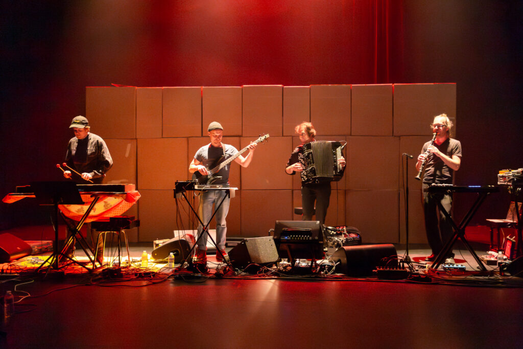 Vanaf Jeroen Stevens (percussie), bassist/keyboardspeler Hannes d’Hoine, Roel van Camp op accordeon en Han Stubbe aan de klarinet hun eerste noot inzetten, ga je mee op trip. Of je dat nu wil of niet. Je gaat mee in een soort trance, versterkt door die machtige beelden van dhr. Trouvé die worden geprojecteerd op een muur van kartonnen dozen achter de band.