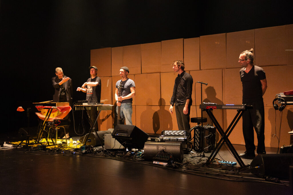 Vanaf Jeroen Stevens (percussie), bassist/keyboardspeler Hannes d’Hoine, Roel van Camp op accordeon en Han Stubbe aan de klarinet hun eerste noot inzetten, ga je mee op trip. Of je dat nu wil of niet. Je gaat mee in een soort trance, versterkt door die machtige beelden van dhr. Trouvé die worden geprojecteerd op een muur van kartonnen dozen achter de band.