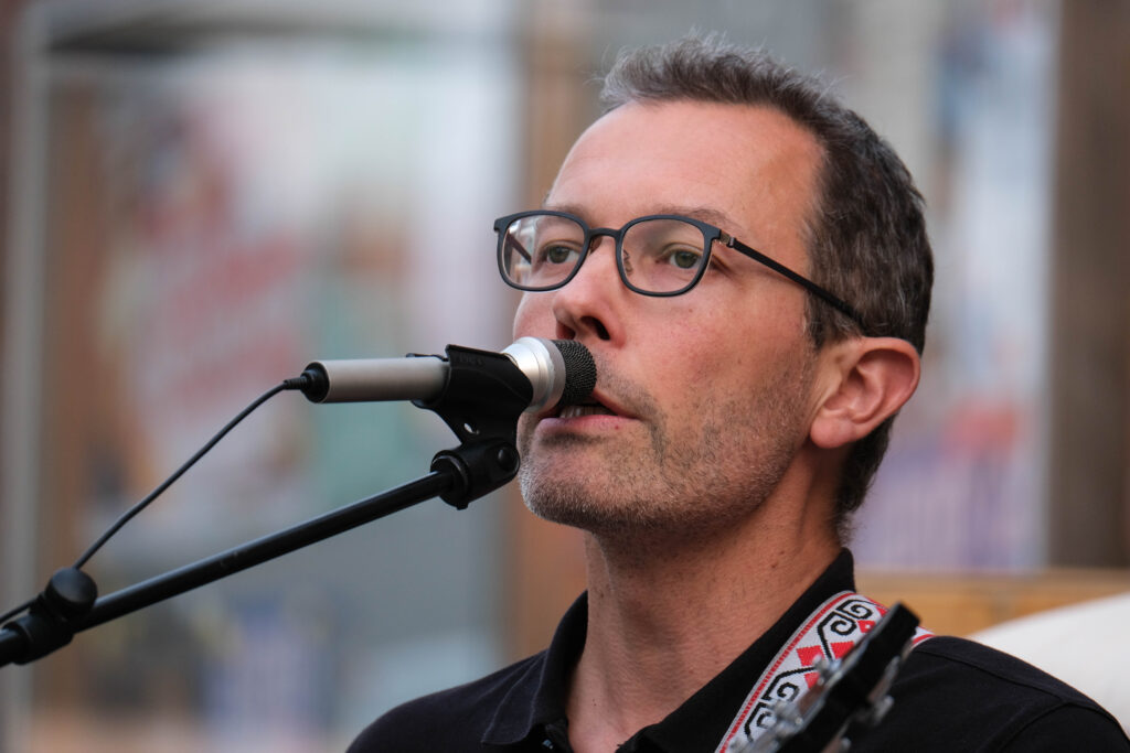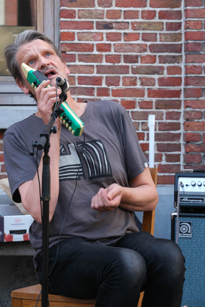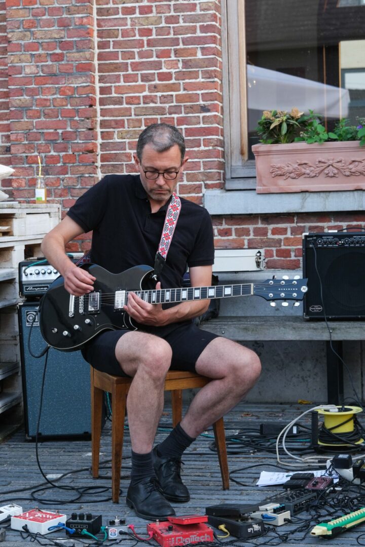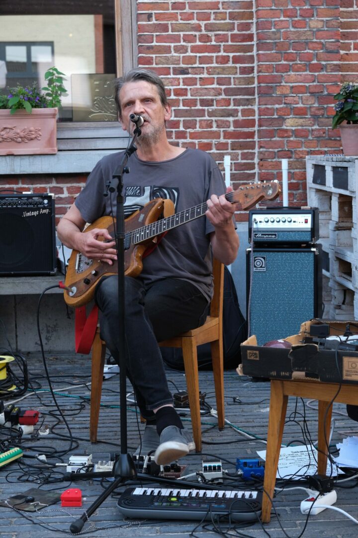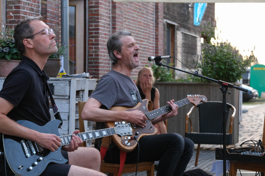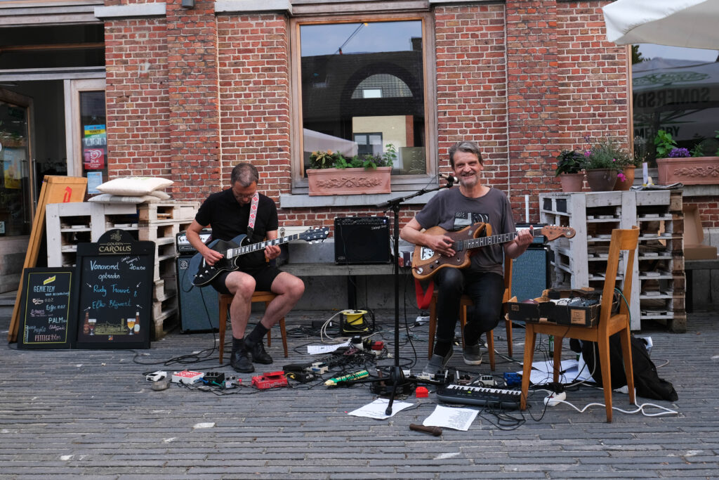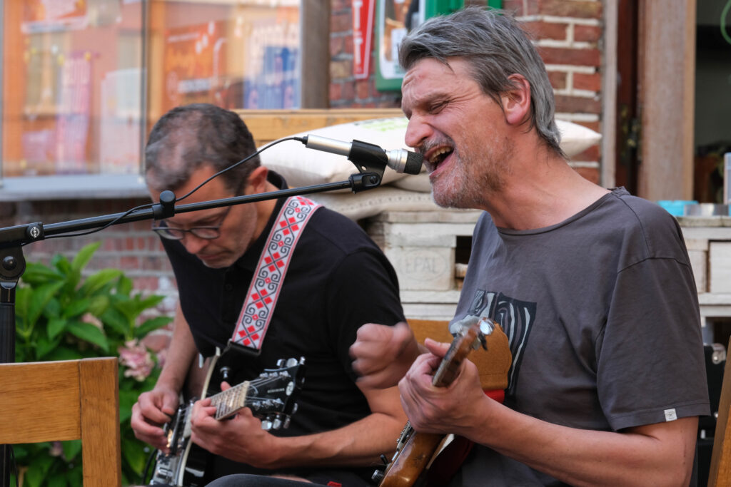 De setting is bijzonder gemoedelijk. Trouvé en Blijweert zitten voor het station van Berlaar op het terras van café Station Balder. Er is een beperkt publiek aanwezig maar eigenlijk zijn we daar allesbehalve rouwig om. Intimiteit heerst en maakt de concertervaring des te intenser, en aan de lachende gezichten te zien, zijn zij die gekomen zijn ook wel effectief fans.