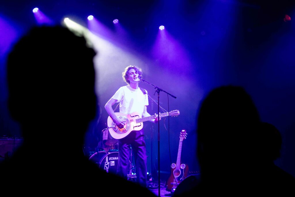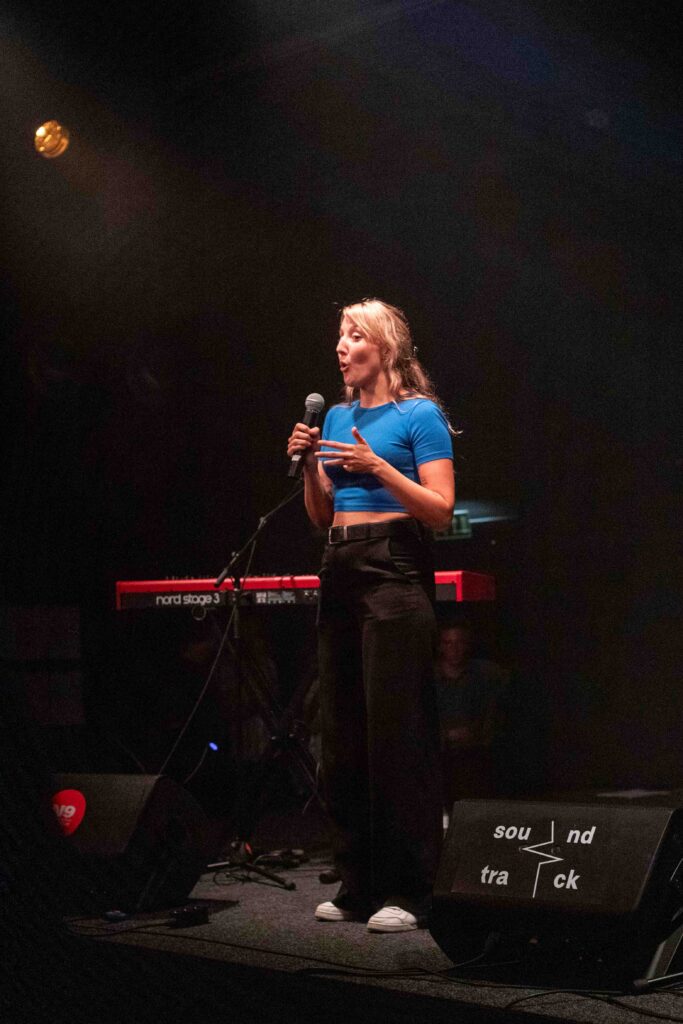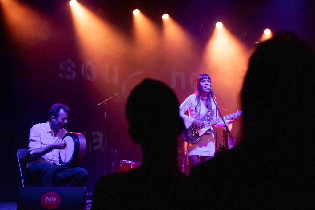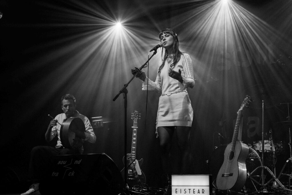 Eistear legde haar ziel bloot op het podium met songs over “het religieus nest” waar ze opgroeide (Mother, “She ruled her kids with an iron face”) en in een ander nummer over haar persoonlijke verwerking van een abortus. Geen zoete koek dus. Ze speelde pré-rock-‘n-roll folkmuziek op gitaar en zong loepzuiver, soms gebackt door een octaver in een pedaal. De eerste twee songs werden begeleid door een medemuzikant met een trommel die ook basgeluiden voortbracht, de laatste twee nummers bracht Eistear solo. We zouden dat omgedraaid hebben. Meezingmomenten zijn hot tegenwoordig, hier was dat wat haalbaarder voor het publiek, in Waltz dat de set afsloot. Maat van drie dus; wie is maat van Eistear? We vonden wat te weinig aansluiting met de muziek van 2023 om dit grote kansen te geven in het pop-rockcircuit. Het folkcircuit lonkt dan weer wel.