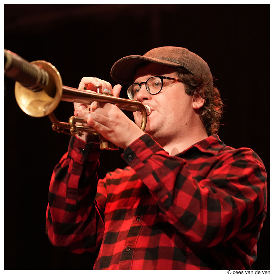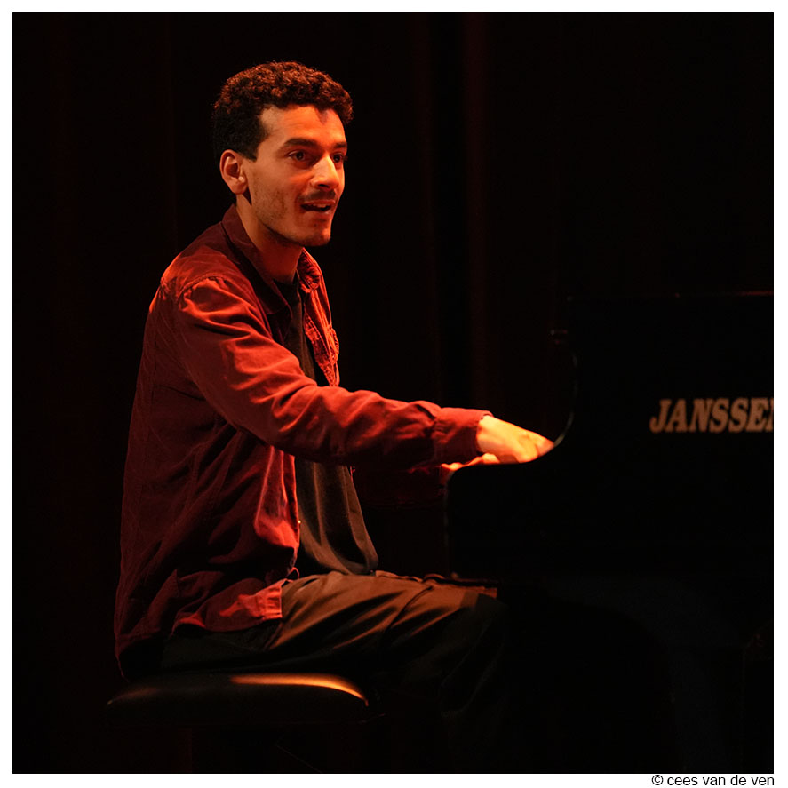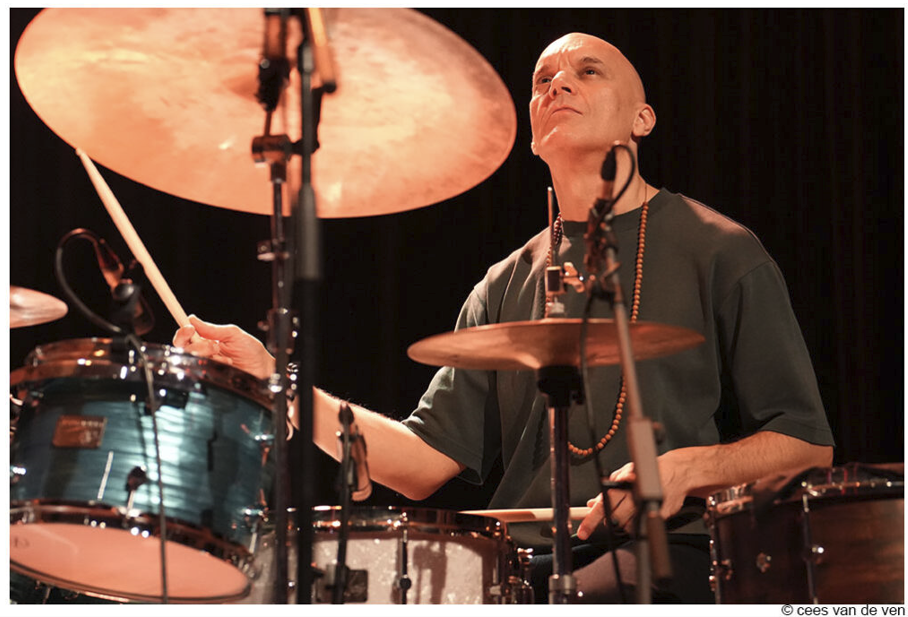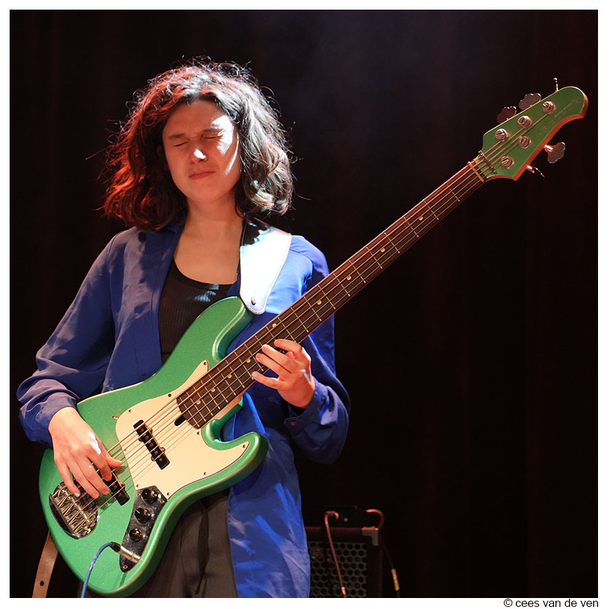 Positivv werd door Wajdi Riahi ingezet op de piano, zachtjes meanderend, Galland zuinig zachtjes op de percussie, met dan de blazers, Pierre-Antoine Savoyat op trompet, Shoko Igarashi op tenorsax en Yonatan Hes op altsax, met de bas van Louise van den Heuvel die subtiel en tegelijk toch ook prominent de tune meespeelde. Geniaal hoe de melodie zich ontwikkelde met heerlijk virtuoos toetsenspel van Riahi, mooie koperen tonen, een fijn bas-intermezzo van Louise en Gallands percussiewerk dat alles mooi met elkaar verbond.