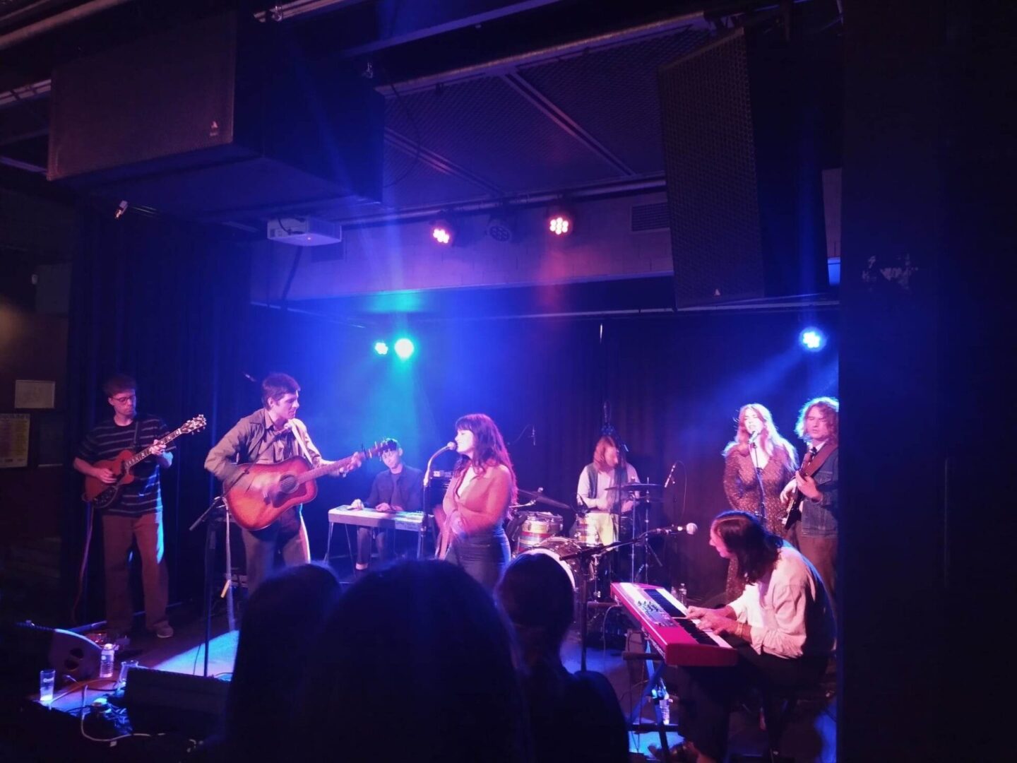 En dan is het de beurt aan Sylvie. Een zevenkoppige band betreedt het podium van het Trix café en biedt daarmee onmiddellijk al een sterk contrast met het eenmansvoorprogramma. Lapsteel, piano, drie gitaren, drums, bas en een hele hoop samenzang wordt samengebracht in een poging om de nummers van hun debuut tot leven te wekken.