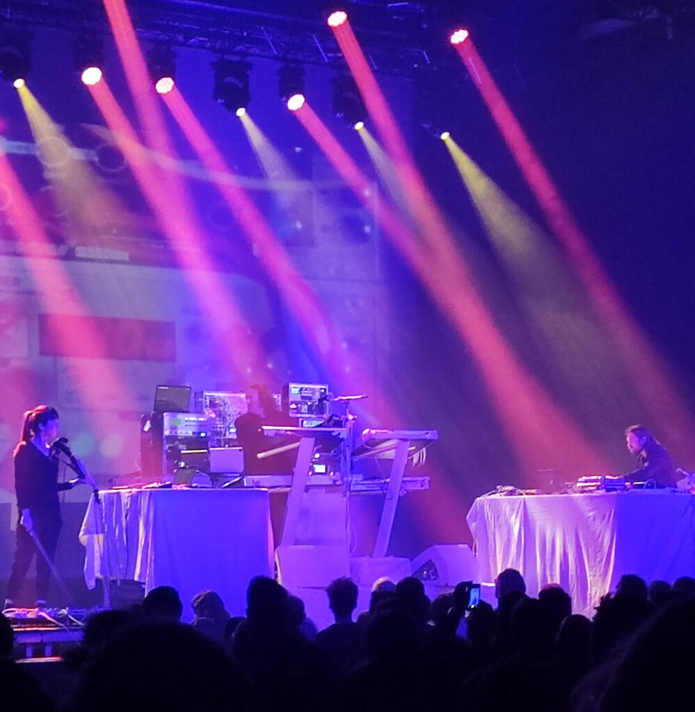 Quaeschning stond achter een imposante keyboard constructie met een hele wand elektronica achter zich. Frick bediende zich van wat zuinigere elektronica. Yamane speelde soms ook wat op een mini-keyboard maar wist ons vooral te verblijden met haar prachtige vioolklanken. En… dansmoves! Van dansmoves gesproken: geloof het of niet maar er werd, zo ongeveer drie uur lang, flink wat gedanst in de zaal. Yamane deed dus lustig mee waar Quaeschning en Frick op Kraftwerkse wijze onbeweeglijk bleven staan en zitten, in volle concentratie op de fijne elektronische klanken die ze de zaal in stuwden.