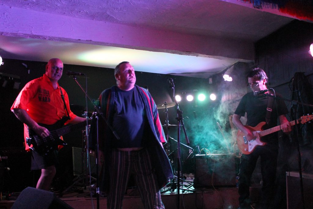All of a sudden I saw a man in pyjama’s and a robe walking along the venue. He was accompanied by his friend wearing combat shoes under a skirt. A few moments later they went on stage with two other guys. They seemed to be the band.