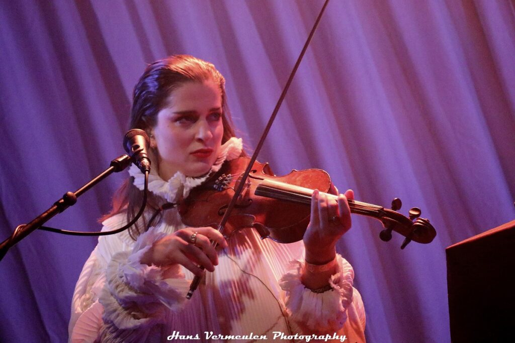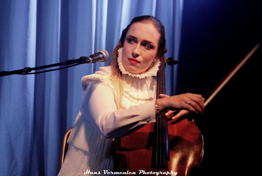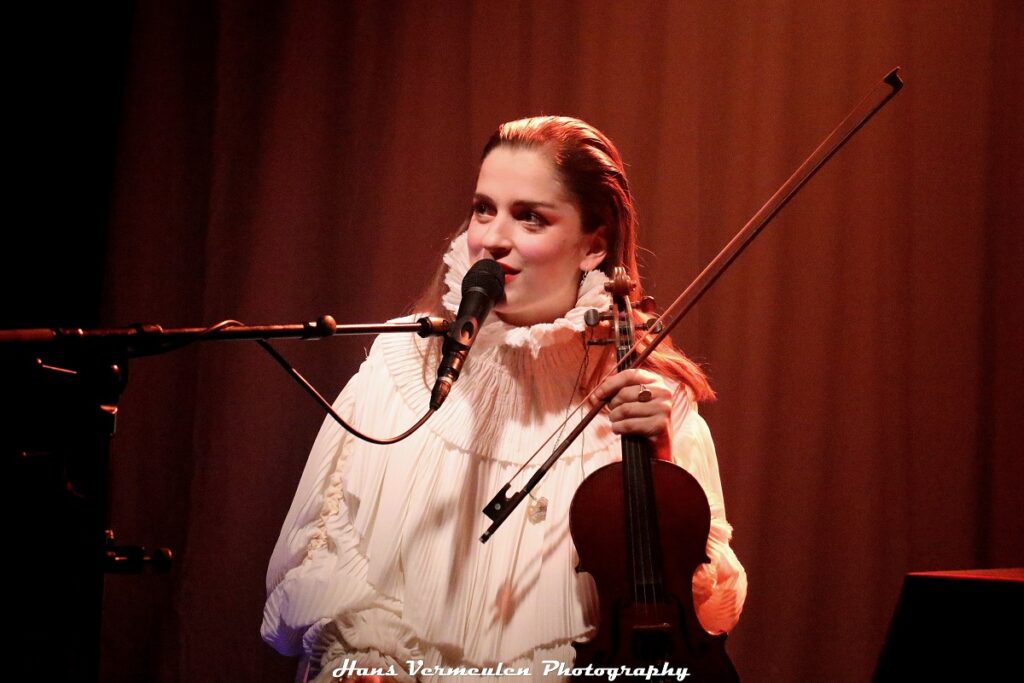 Een blik op het podium verklapte al dat er met Tsar B (with strings) geen doordeweeks concert ging volgen. Het werd er zelfs eentje met een hoog zondagsmisgehalte. Een tafel stond rijkelijk gedekt, kandelaars, oversized druiven, wijnglazen en een uil zagen dat het goed was. Het is uiteraard ook het decor van de score voor Les Diners De Gala, dat niet zomaar verwijst naar het kookboek van Salvador Dali. Tsar B is natuurlijk het alter ego van Justine Bourgeus die als klassiek geschoolde violiste al furore maakte op grote festivals met een donkere opzwepende vorm van R&B en een verleden heeft bij School Is Cool. Ze nam aan de ene kant van de lange tafel plaats. Trui Amerlinck (Rosa Butsi, Ivy Falls) nam aan de andere kant plaats met haar cello. En we hebben onze strijkers zie! Heel opvallend waren de white dresses (haha jaja) die beide dames alle eer aandeden. De molensteenkraagachtige outfit die we al eens bij Anna Boleyn zagen kan zeker geen ultiem comfort geboden hebben, maar het zorgde er wel voor dat het plaatje visueel af was.