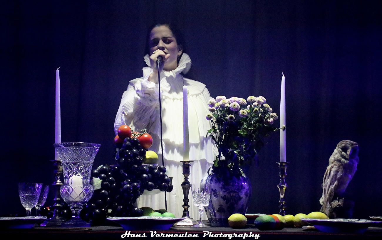 Een blik op het podium verklapte al dat er met Tsar B (with strings) geen doordeweeks concert ging volgen. Het werd er zelfs eentje met een hoog zondagsmisgehalte. Een tafel stond rijkelijk gedekt, kandelaars, oversized druiven, wijnglazen en een uil zagen dat het goed was. Het is uiteraard ook het decor van de score voor Les Diners De Gala, dat niet zomaar verwijst naar het kookboek van Salvador Dali. Tsar B is natuurlijk het alter ego van Justine Bourgeus die als klassiek geschoolde violiste al furore maakte op grote festivals met een donkere opzwepende vorm van R&B en een verleden heeft bij School Is Cool. Ze nam aan de ene kant van de lange tafel plaats. Trui Amerlinck (Rosa Butsi, Ivy Falls) nam aan de andere kant plaats met haar cello. En we hebben onze strijkers zie! Heel opvallend waren de white dresses (haha jaja) die beide dames alle eer aandeden. De molensteenkraagachtige outfit die we al eens bij Anna Boleyn zagen kan zeker geen ultiem comfort geboden hebben, maar het zorgde er wel voor dat het plaatje visueel af was.