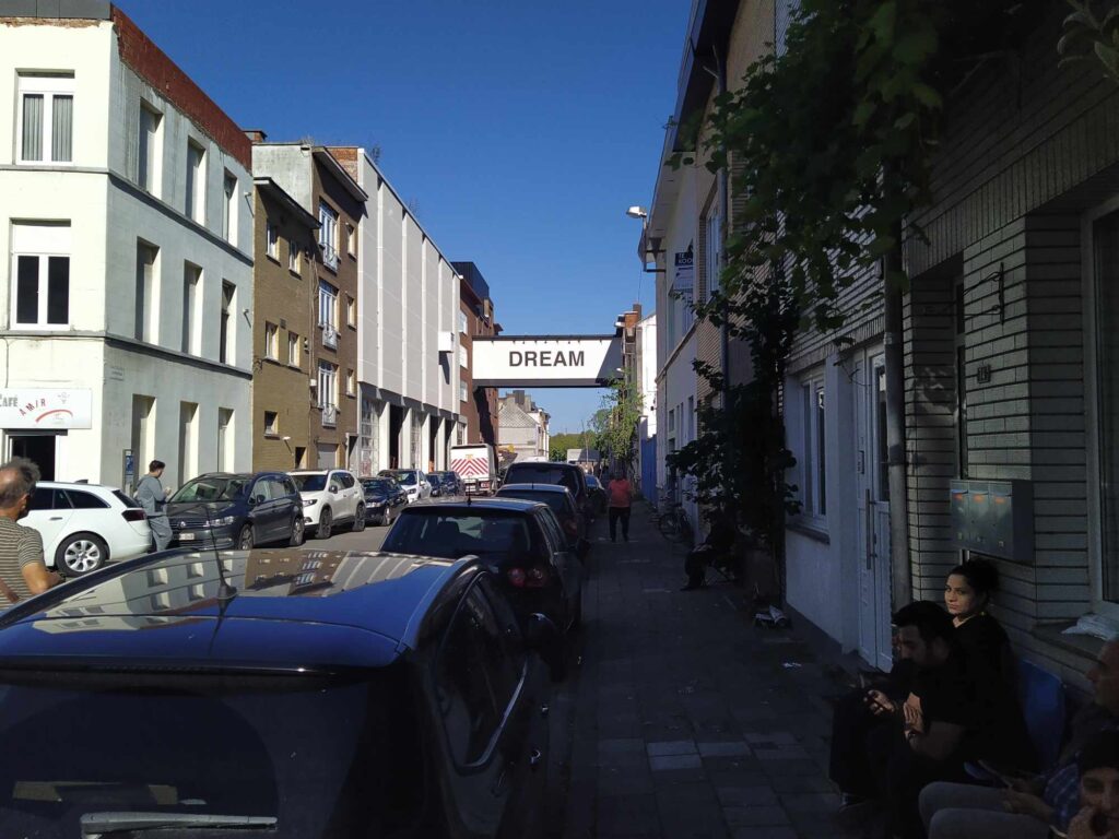 Een radio gestuurde auto bleek onze gids voor het laatste deel van de wandeling. We volgden gestaag het autootje door de straten van Antwerpen en hielden na enkel minuten halt aan een gigantisch spandoek met daarop, je kan het al raden: “Dream”.