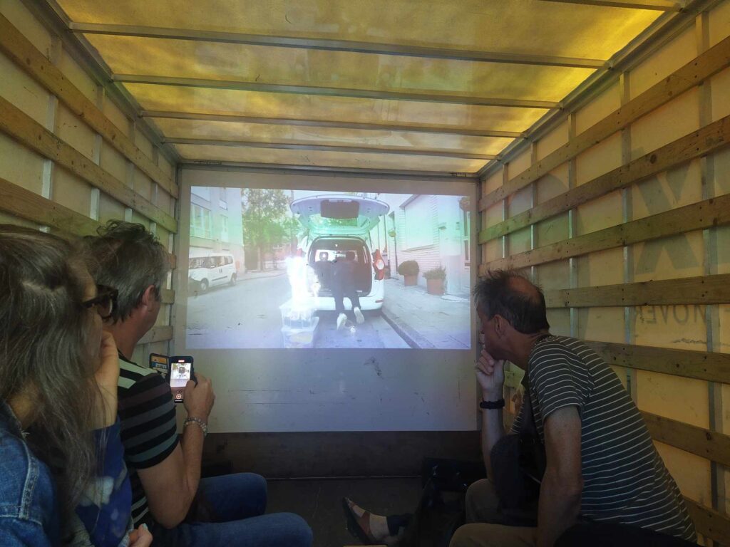 De volgende stop was een verhuiswagen die, voor de gelegenheid, omgebouwd was tot projectieruimte. De ruimte vulde zich met subtiele muziek, terwijl we beelden te zien kregen van een man die de koffer van zijn wagen systematisch vulde met planten en hiermee een hoofdstuk in zijn leven leek af te sluiten.