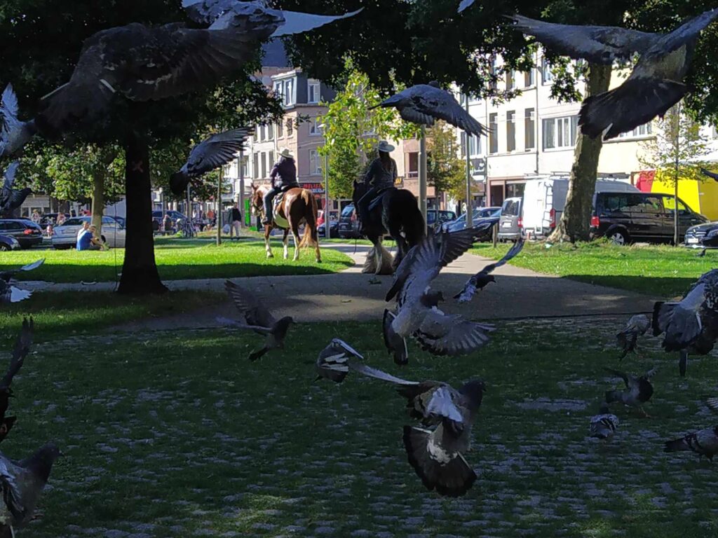 De volgende stop was op een pleintje waar we ons vakkundig, al zeggen we het zelf, en volgens instructie op één van de banken rond het plein zetten. Honderden duiven kleurden het pleintje terwijl All I Have To Do Is Dream uit de kruinen van de omliggende bomen schalde. De duiven vlogen heen en weer en werden onbedoeld deel van deze surrealistische situatie. En dan hadden we het nog niet over die twee cowboys die, te paard, subtiel door deze scene dwaalden. En nee, wij verzinnen dit niet!