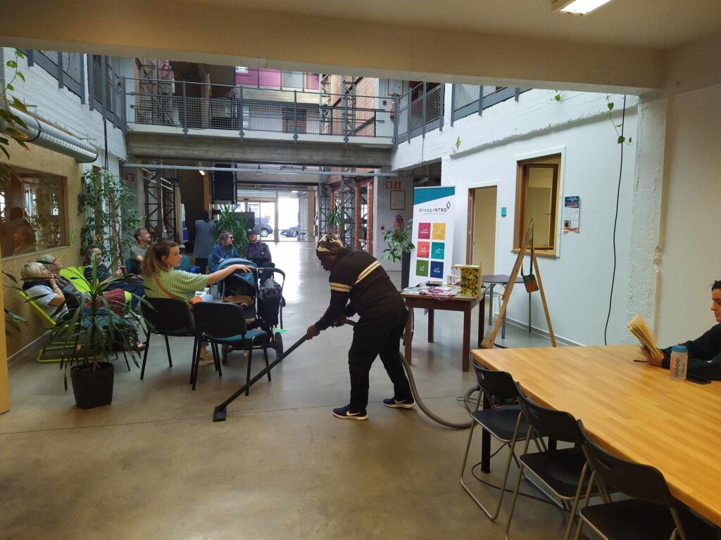 Wij gingen ervan uit dat de wandeling uitsluitend op straat zou plaatsvinden, maar niets was minder waar. De eerste stop was op het binnenplein van een appartementsblok waar we, met een hoofdtelefoon vol Zwerm-tonen, keken hoe een man een plastic cactus probeerde op te blazen op de derde verdieping van het gebouw. En dat was nog maar het begin.