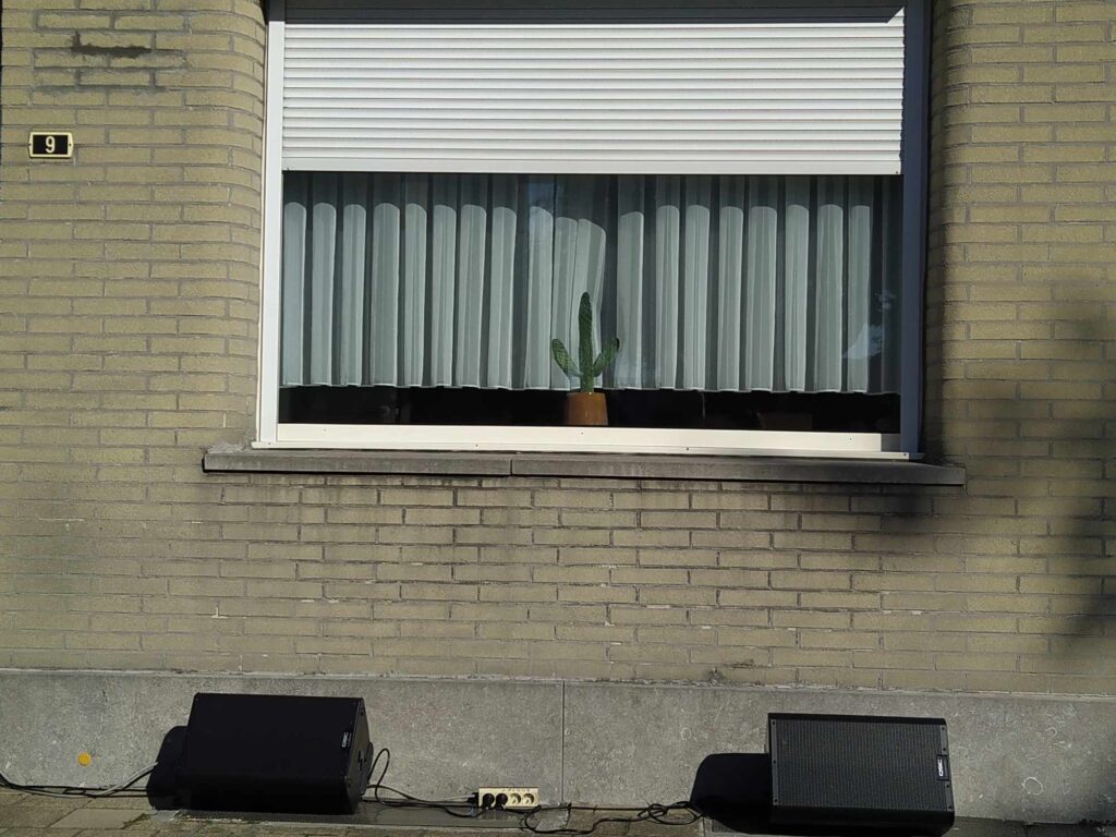 De experimentele stoet trok richting een miniatuur tribune die vakkundig voor de gevel van een huis gepositioneerd werd. Langzaam ging het rolluik naar boven en werden we geconfronteerd met een eenzame cactus op een vensterbank terwijl wederom geluiden van Zwerm zich meester maakten van het moment. En dan, enkele minuten later verdween het geluid in stilte; ging het rolluik weer langzaam dicht en zetten wij onze wandeling verder.