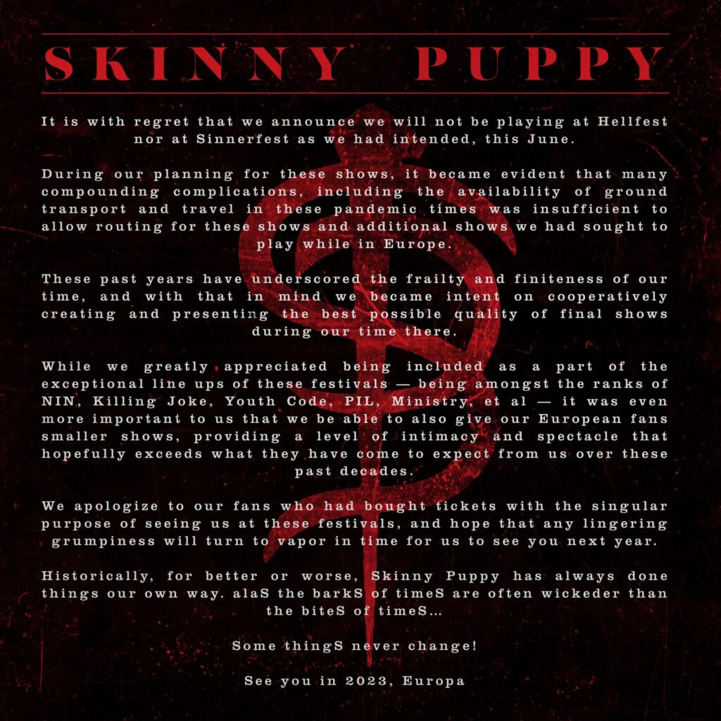 Jammer genoeg stelt de band zijn Europese tour die gepland was voor 2022 uit naar volgend jaar. Op de Facebookpagina van Skinny Puppy, legt de band uit waarom.