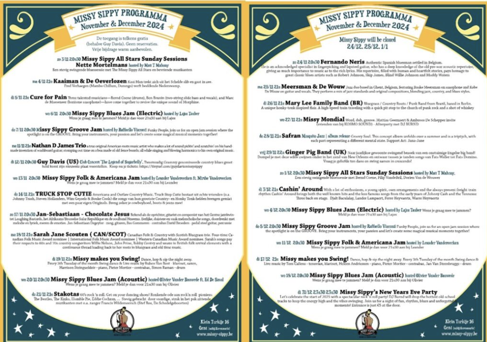 Onder het motto “I’ve got the blues, but I’m gonna keep on moving”, geen klokjes of kerstjingles in de Gentse blues- & rootsclub Missy Sippy, maar een november én december goed gevuld met live muziek, jams en dans!