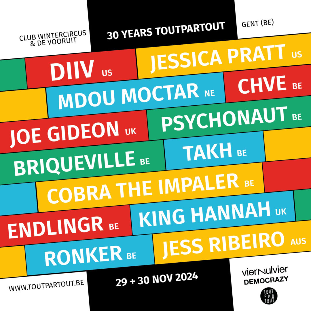 In 2024 bestaat het Europese boekingskantoor TOUTPARTOUT 30 jaar, en dat wordt groots gevierd met een weekend vol topartiesten in hun thuisstad Gent. In samenwerking met Democrazy en VIERNULVIER organiseren ze op vrijdag 29 en zaterdag 30 november een tweedaags festival in Club Wintercircus en de Vooruit. Op de verschillende podia zullen enkele van de beste alternatieve bands van dit moment optreden.