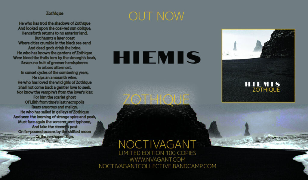 Na Nachtstücke (2018), Hyperborea (2019), Thule (2019), Radix (2020) en La Chose (2021), is hij met Zothique in het korte Hiemis-bestaan al aan zijn zesde album toe. Qua geluid lijkt hij steeds meer de rituele kant op te gaan, steeds in combinatie met donker verontrustende drones. Maar vooral het conceptuele aspect van zijn werken lijkt steeds meer aan belang te winnen.