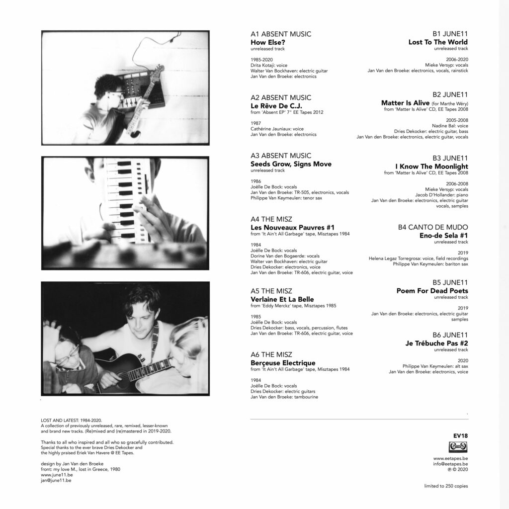 “In de gloriedagen van de cassettes was ik een fervent bewonderaar van The Misz, een lo-fi minimal wave, maar charmante combo uit Gent. Ik had hun drie tapes in mijn verzameling en nogal wat cassettecompilaties met hun tracks, allemaal verkregen via de platenwinkel waar ik tussen 1983 en 1988 hielp. Het was die periode en tijdschriften als Mad In Belgium, die me inspireerden om in 1987 mijn eigen label EE Tapes te starten. Tegen die tijd waren The Misz ontbonden, dus we hebben nooit contact opgenomen. En de jaren gingen voorbij… Anno 2008 was mijn eerste sociale media-ervaring MySpace, wat interessant was omdat die pagina een audiospeler had. Zo ontdekte ik een dromerig intiem project genaamd June11. Ze hadden een nummer gepost dat me meteen diep raakte, Matter Is Alive, met de stem van Nadine Bal (BeNe GeSSeRiT). Dus ik nam contact op en de persoon achter het project bleek Jan Van den Broeke te zijn: de ene helft van The Misz en Absent Music was later zijn soloproject. Ondertussen is Jan ongeveer een decennium actief als medewerker bij EE Tapes, als Head of Design and Technics”, aldus Eriek Van Haavere.