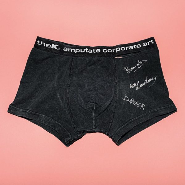 Geen remspoor of urinevlek te zien op de cover van het nieuwe album van The K. Het moet gezegd: Burroughs, Danger & von Landau zijn propere jongens! De aan enige slijtage onderhevige en gesigneerde boxershort die dient als hoesbeeld voor album Amputate Corporate Art laat het ergste vermoeden over welk lichaamsdeel de kunstzinnige amputatie precies handelt.