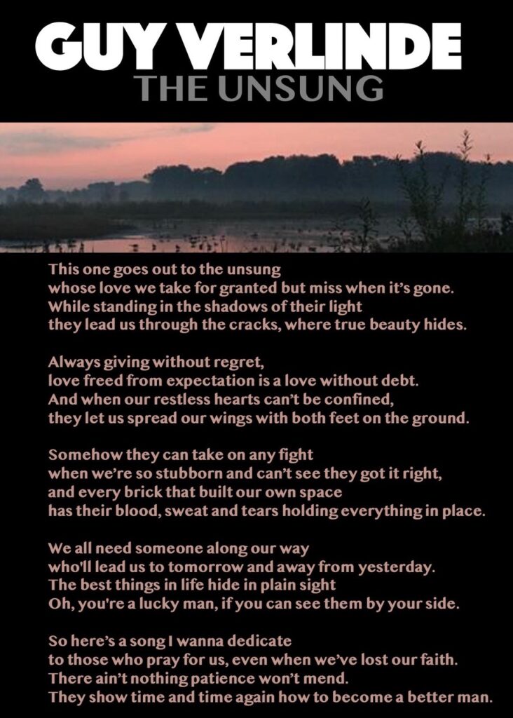 De Gentse bluesmuzikant Guy Verlinde brengt met zijn nieuwe single The Unsung een ode aan alle onbezongen helden. Hij had daarbij op 5 december, internationale dag van de vrijwilliger, de vele vrijwilligers in gedachten, die zich vanuit 13 Gentse organisaties sinds de eerste lockdown verenigden onder de noemer ‘Gents Solidariteitsfonds’, maar evengoed de buren, familie, enz. die klaarstaan om mensen in hun omgeving bij te staan.