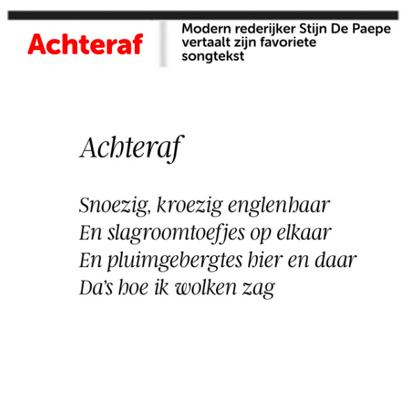 Een jaar geleden overleed dichter Stijn De Paepe op 42-jarige leeftijd aan de gevolgen van darmkanker. Stijn was vooral bekend als huisdichter bij de krant De Morgen. Vóór zijn dood stuurde hij een Nederlandse vertaling van Both Sides Now van Joni Mitchell door naar Fran de Vos en Peter Boone. Ze waren zo’n fan van Stijns vertaling dat ze besloten om het nummer te coveren als eerbetoon aan hem.