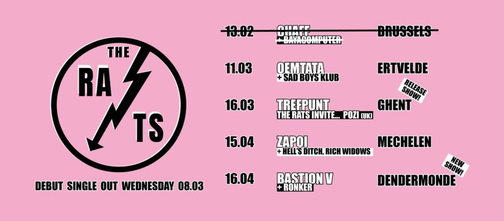Het jaar van de rat ligt officieel al 2 jaar achter ons, maar 2023 zou wel eens het jaar van The Rats kunnen worden. Niet te verwarren met de Britse rockband uit de jaren 60 of de 99 andere bands met dezelfde bandnaam, uiteraard, want het gaat wel degelijk over de nieuwe Gentse postpunkband.