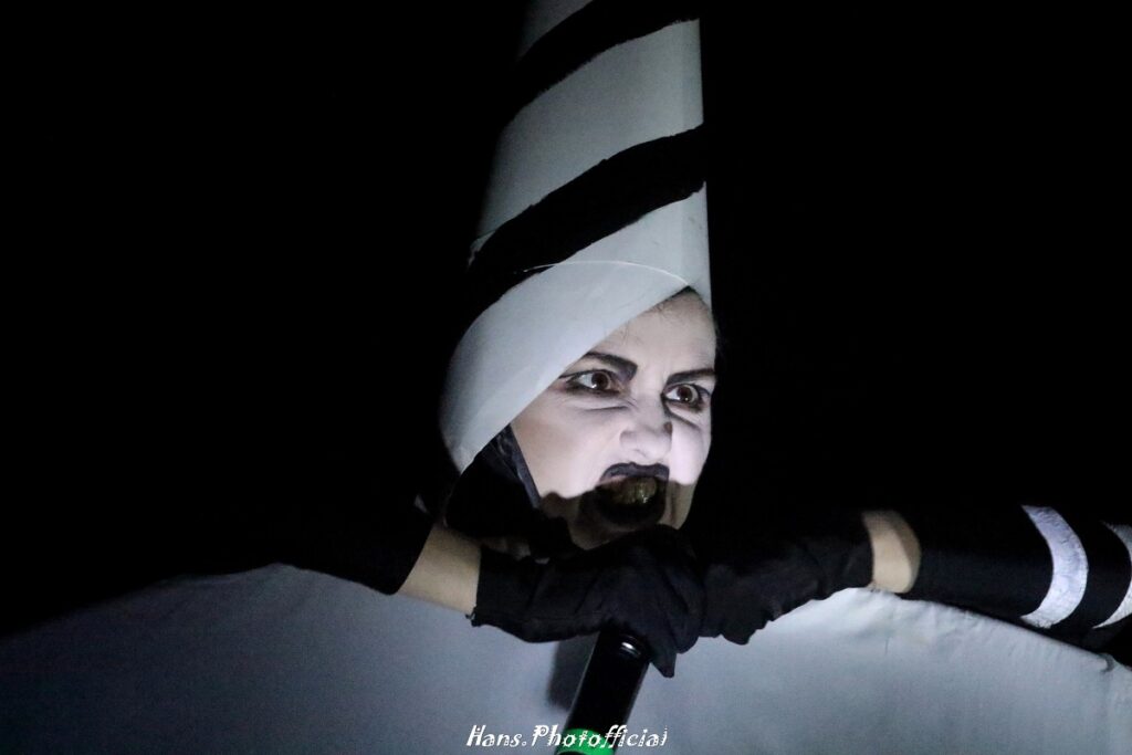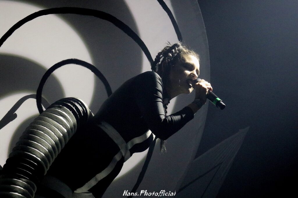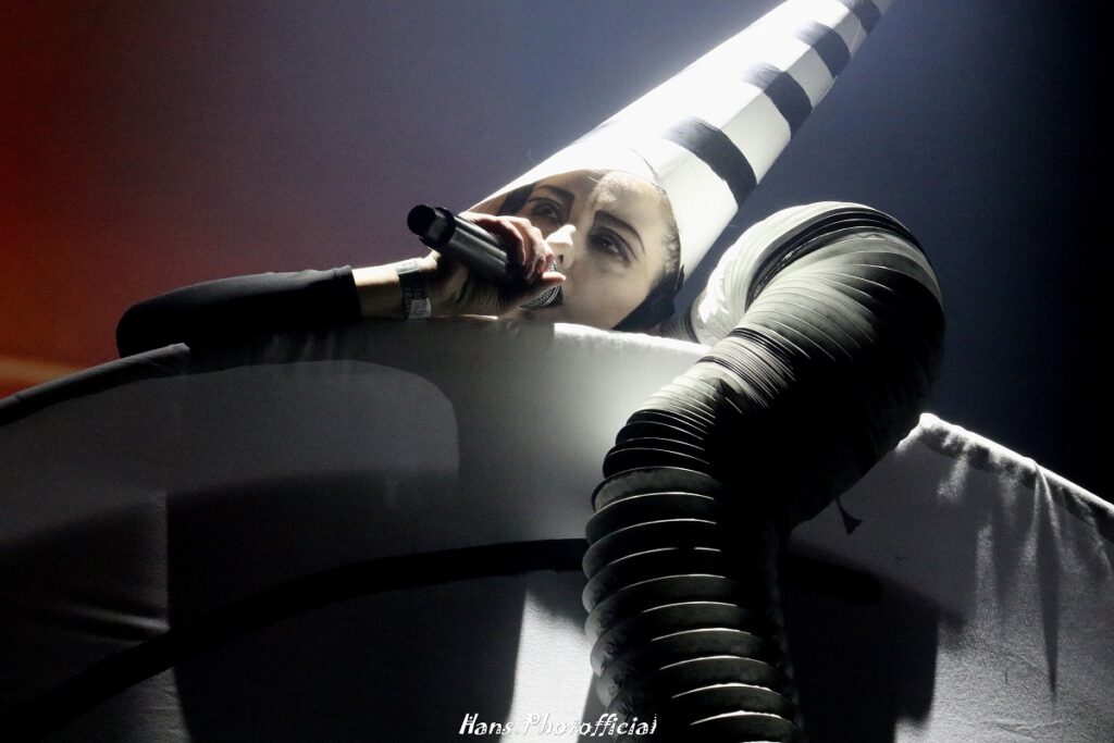 Dé act van de avond was zonder twijfel Geneva Jacuzzi. Niet zomaar prikkelende electro, maar een concept. Met de intro alleen al, kregen ze de overvolle zaal nagenoeg stil. Een leeg podium met enkele grote stukken zwart-wit artwork en kreunende “shht…” die als een smeekbede door de boxen galmde en zijn effect niet miste. Twee dansers in aansluitend zwarte full bodysuits, met een zwart-wit-beschilderde ‘dampkapbuis’ verbonden met de onherkenbare frontvrouw, die verpakt was in met spiralen beschilderde ruimtefiguren. Als een drieledige, dansende eenheid trokken ze eerst doorheen het publiek, om dan een spektakelshow neer te zetten. Eentje waarbij het visuele misschien nog veel sterker binnenkwam dan het auditieve.